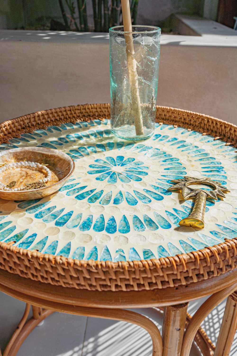 Each table in the Bloom Rattan Table Set features a unique mother of pearl top, with inlays meticulously arranged to create a captivating, light-reflecting design. Every piece is a unique work of art, enhancing your room with its shimmering, serene aesthetic.